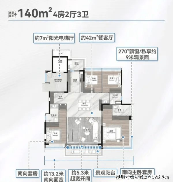 140㎡四房三卫户型,总价约980万起,南向13.2米面宽搭配双套房设计,空间舒适度大幅提升。270°环幕飘窗是该户型的亮点之一,业主坐在家中就能欣赏到优美的湖景,无论是清晨的第一缕阳光,还是傍晚的湖岸晚霞,都能尽收眼底。双套房设计满足了三代同堂的居住需求,长辈和年轻人都能拥有独立的私密空间。